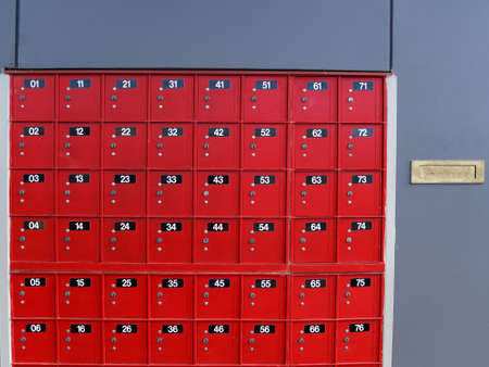 Red numbered 01 to 76 post office boxes at a mail centre in New Zealand.