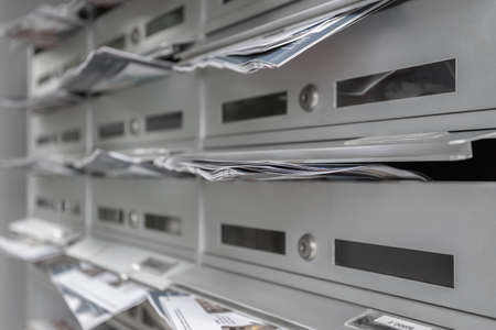 Modern mailboxes filled of flyers. Business and advertising concepts. Shallow depth of field.