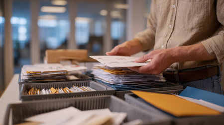 Medium shot of an office worker sorting physical mail into organized trays demonstrating efficient handling of incoming traditional postal items.