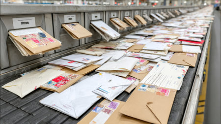 Medium shot of automated mail sorting robots efficiently organizing envelopes on a conveyor belt in a modern postal facility.
