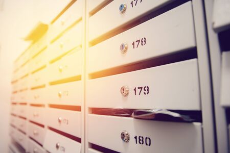 Traditional residential metal postboxes with apartment numbers at the modern multifamily building