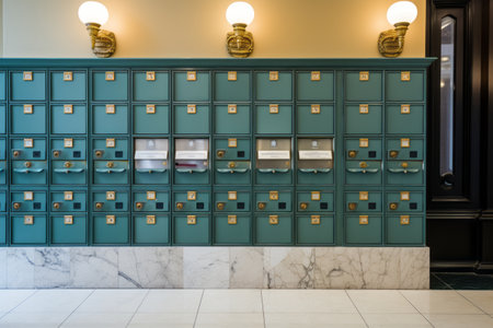 Brown steel Mailboxes in an apartment residential building inside. Modern rows of numbered mailbox, creative design mail backgrounds. Urban correspondence concept. Copy ad text space. Generated AI