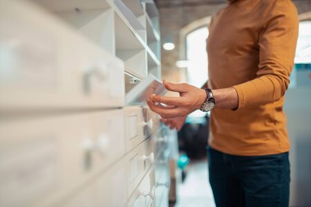 Man opening box. Close up of man wearing orange polo neck and watch on hand opening box