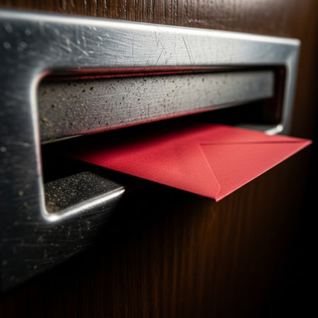 Extreme close-up of a red envelope being pushed into an old, tarnished brass mail slot in harsh sunl