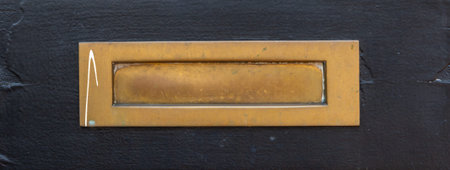 Close up of dark black noble wood entrance door with square mail slot with copper metal brass inscription letters concept for mailings messages and letter delivery