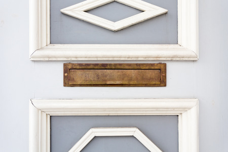 Old copper letterbox or mailbox in the white vintage wooden door, traditional way of delivering letters, newspapers and ther correspondence to the house