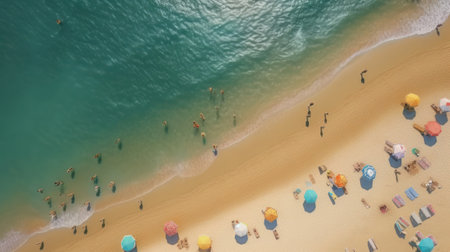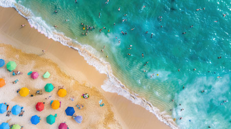 A birdseye view of a sandy beach adorned with colorful umbrellas, people enjoying the sun and water, against a backdrop of a vast blue sky AIG50