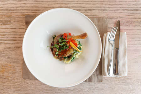Hot dish with meat and vegetables in a white plate. The waiter carries the dish in the restaurant.