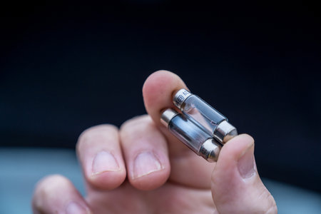 Woman hand holding yellow amp rated car fuses before inserting them fuse box closeup shot
