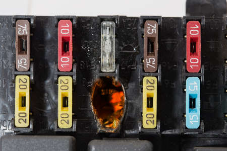 Damaged burnt car electric system fuse in the background of a fuses box of a modern car.