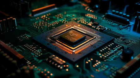 A detailed scene featuring a futuristic microprocessor positioned on a circuit board, highlighted by glowing connections that symbolize advanced technology and innovation.