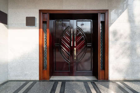 Panorama Double arched wooden entrance door in a cream colored exterior wall with paved walkway