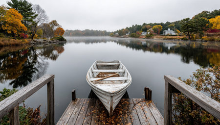 A small white boat rests on a wooden dock, facing a calm lake under an overcast sky. The image showcases autumn foliage with vibrant yellow and orange colors. The composition provides a sense of peace, suitable for commercial or editorial applications related to nature or travel.