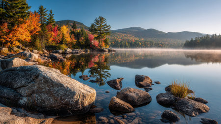 Bright autumn hues adorn the landscape as the calm lake reflects the surrounding trees, creating a peaceful start to the day in a natural setting.