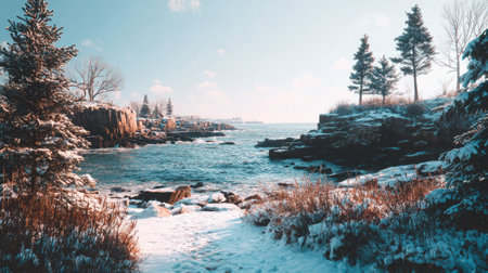 This scenic image showcases a coastal landscape with snow-covered rocks and evergreen trees. The scene is bathed in cool tones, featuring clear skies and calm water. It is a visually appealing scene, likely suitable for editorial or commercial projects related to nature, travel, or seasonal themes.