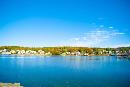 Fall colors and New england homes across harbor of Boothbay town and harbor, Maine USA.