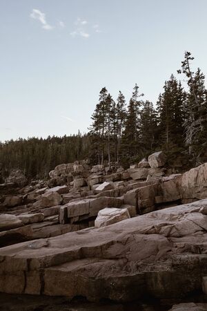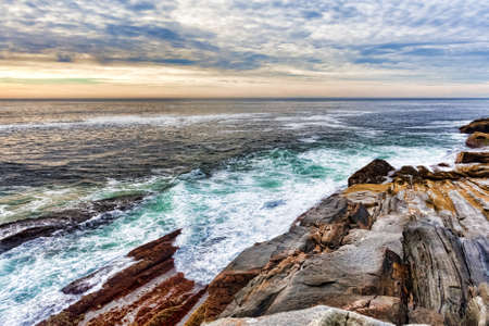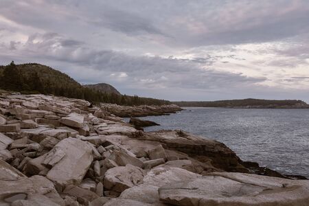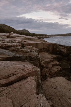 Rugged cliffs of Ocean Path along the shoreline of Acadia National Park in Mount Desert Island, Maine after sunset.
