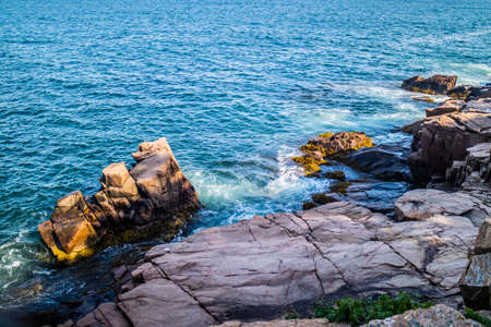 Waves coming in and crashing into rocky coast at Acadia in Bar Harbor Maine