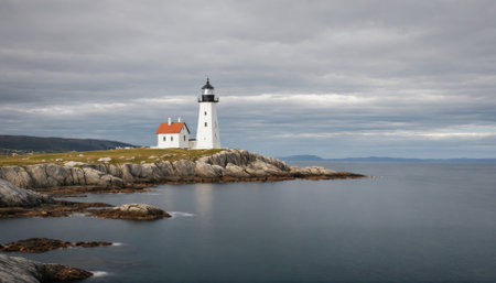 A tall white lighthouse stands on a rocky peninsula overlooking the calm ocean on a cloudy day
