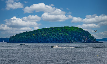 Bar Harbor, Maine, USA - 28 July 2017: A fishing boat is heading out full of yellow lobster traps in Portland Maine with The Porcupine Islands in background.