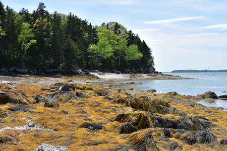 Rocks blanketed with seaweed along the Maine coast in Casco Bay.
