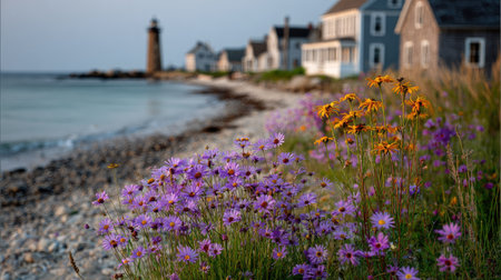 A tranquil coastal scene depicts wildflowers in the foreground and a lighthouse and houses in the distance. The composition features a shallow depth of field, with soft focus on the background. The lighting suggests late afternoon or early morning, enhancing the serene atmosphere. This image is suitable for various commercial uses, including travel and lifestyle content.