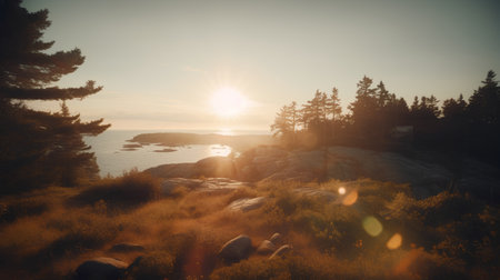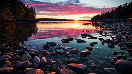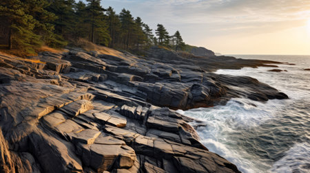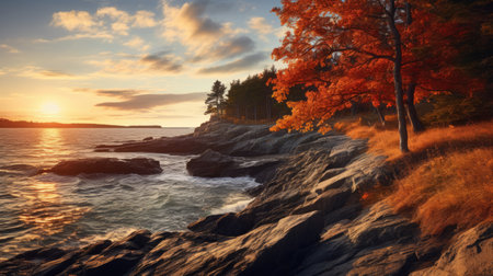 autumn sunrise illuminating the rocky shore of rocky point shoreline. this stunning image, captured in the style of cryengine, showcases highly detailed foliage in dark orange and red hues. with its uhd resolution, this american scene painting-like photograph resembles a national geographic masterpiece, offering a high-resolution visual treat. ai generated