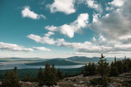 Beautiful landscape with a mountain range on a blue sky with white clouds on the forest meadows and lake in summer Russia, Chelyabinsk region, Zyuratkul Range