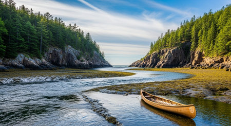 A serene view of the Acadia National Park coastline with rugged cliffs. No people, copy space.