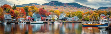 A vibrant historic town is framed by autumn foliage, with quaint houses lining the waterfront. Boats gently bob in the calm water, reflecting scenic mountains.
