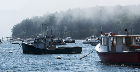 Fishing boats moored in a harbor on a foggy morning in Maine.
