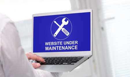 Businessman using computer laptop with maintenance sign on monitor screen for technical support customer service concept.