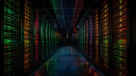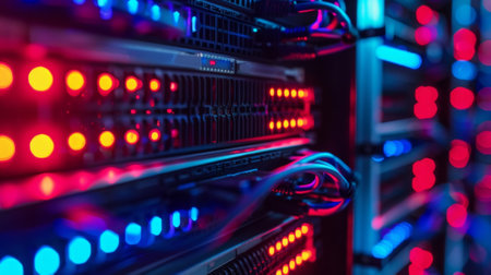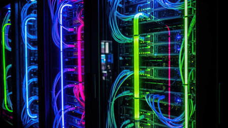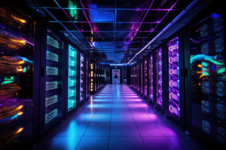 Futuristic server room with bright neon lights.