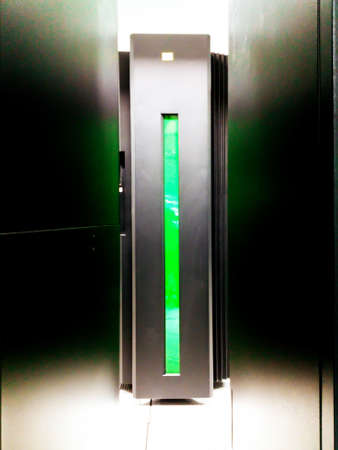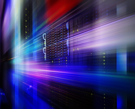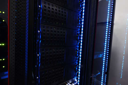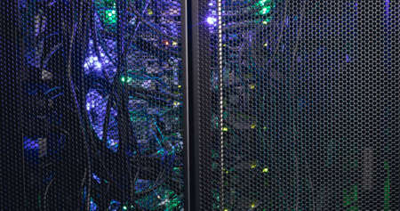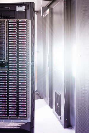 supercomputer disk storage in series of data center equipment. motion blur