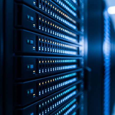 A row of servers in a data center illuminated with colorful lights.