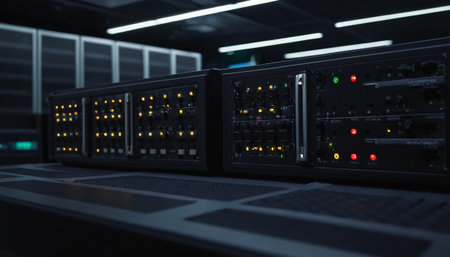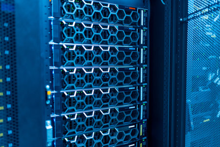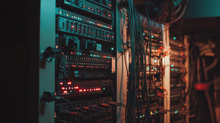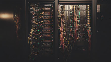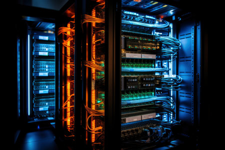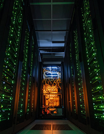 A detailed view of a server rack showcasing illuminated circuit boards and complex wiring, highlighting the technological sophistication of a modern data center environment.