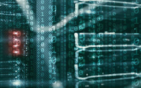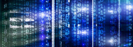 Binary code matrix digital internet technology concept on server room background.