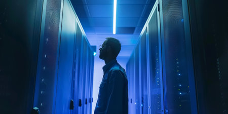 Troubleshooting in a technology data center: Male engineer surrounded by servers. Concept Technology Data Center, Troubleshooting, Male Engineer, Servers, IT Support