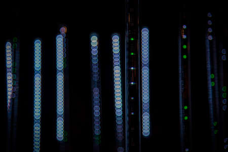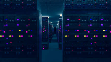 Dark colorful data center or server room rack and lot of data light indicator. Information technology, cyberspace data collection, networking database station.