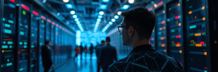 Back view of young man standing in data center and looking at data