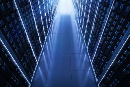Server racks in server room cloud data center. Datacenter hardware cluster. Backup, hosting, mainframe, mining, farm and computer rack with storage information. 3D rendering. 3D illustration