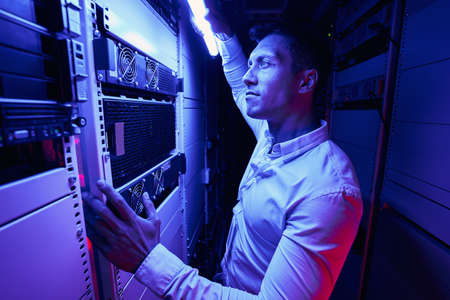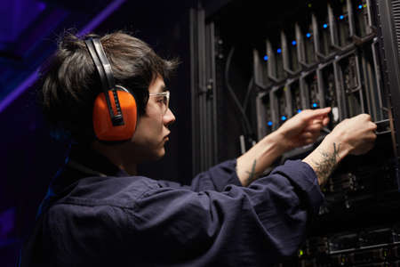 Side view portrait of tattooed young network engineer setting up servers in supercomputer data center, copy space