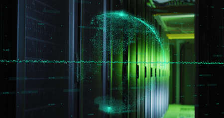 Image of data processing and globe over green lights of computer server. digital interface, cloud computing concept and technology concept digitally generated image.
