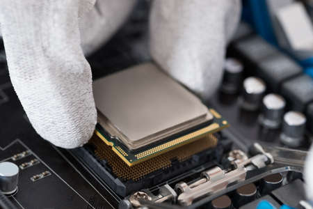 Plug in CPU microprocessor to motherboard socket. technological background. Concept computers hardware.