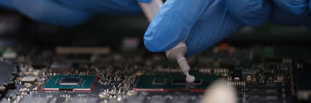 Unrecognizable engineer takes pictures of the laptop motherboard on a smartphone. Electronic renovation, business, occupation concept