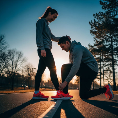 Young couple warming up before jogging in the park at sunset.