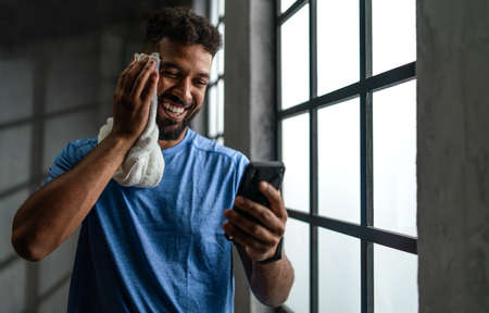 Happy young African American sportsman standing indoors at gym, using smartphone.