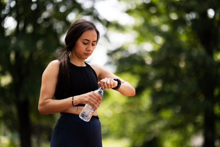 Runner checking pulse on electronic hand watch during training in autumn park. Woman resting with water bottle. Sport devices