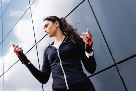 low angle view of young sportswoman gesturing while looking at smartphone
