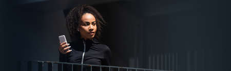 African american sportswoman in earphone holding cellphone outdoors, banner
